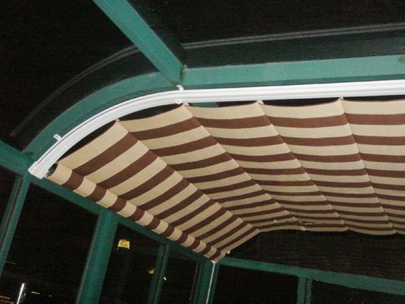 天棚簾每組由左右兩根導軌組成,使用一對同步電機驅動。當電機啟動時帶動履帶,中間由彈性引布桿牽引面料從而達到遮陽的目的。