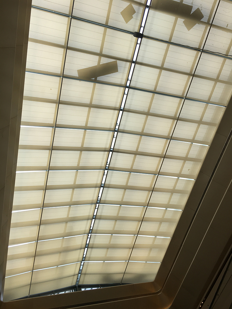 商場采光頂外部遮陽可選擇鋁合金遮陽天幕來做,采光頂內(nèi)部遮陽可選用電動天棚簾(常見的有FCS電動天棚簾、FSS電動天棚簾、FTS電動天棚簾)來做遮陽,商場應(yīng)用最廣泛的是FSS電動天棚簾,F(xiàn)SS電動天棚簾展開時面料平整地張緊著,收起時則完全卷在軸上,讓采光屋頂完全展露,呈現(xiàn)的是一種簡潔明快的裝飾效果。