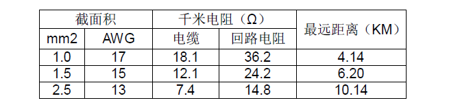 根據(jù)使用屏蔽線纜的技術(shù)參數(shù)可確定檢測儀的最遠(yuǎn)傳輸距離,見下表: